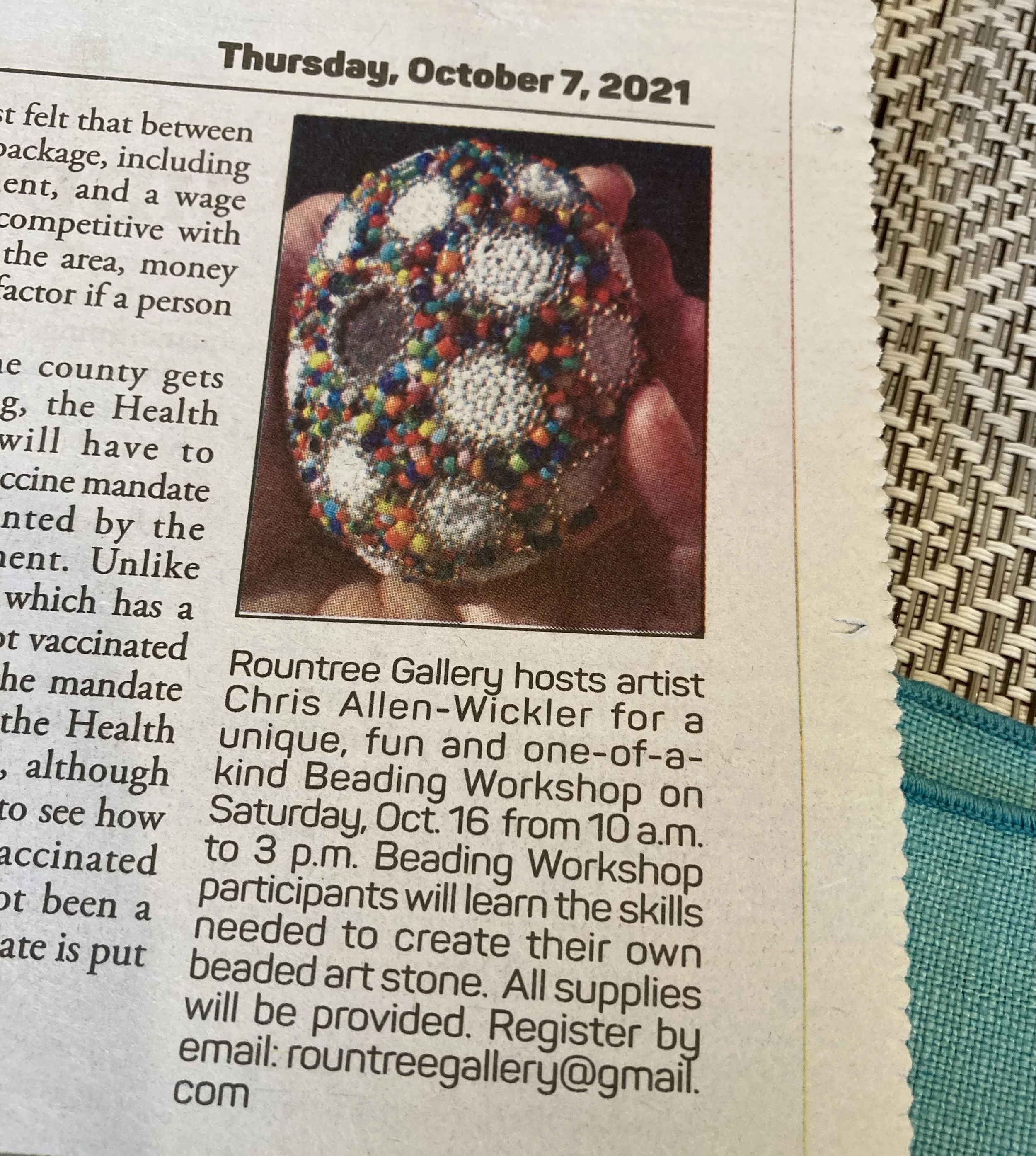 Art galleries and museums often make excellent spaces for workshops! Within this one-day workshop at Rountree Gallery in Platteville, Wisconsin, participants were able to create their own palm-size beaded art stone.