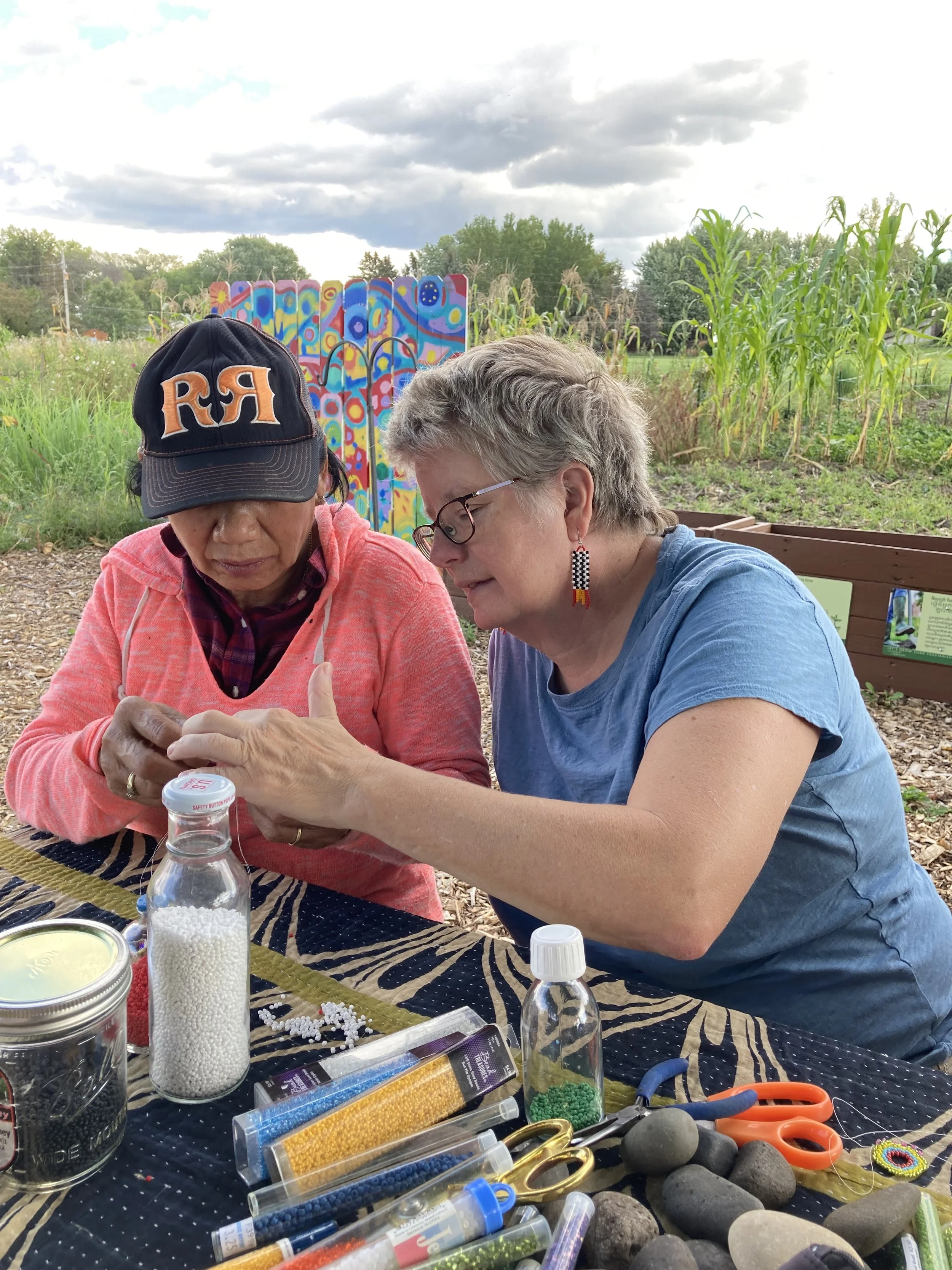 Seed Bead Rock Garden was a two month long workshop, teaching beading around small stones to the growers at The Village Community Garden in Rochester, MN. The workshop was made possible through the Southeastern Minnesota Arts Council grant.
